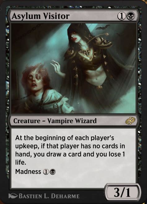 Asylum Visitor is a versatile and powerful card that can be a valuable addition to many MTG decks. Its ability to generate card advantage when an opponent’s hand is empty makes it a potent threat in aggressive and disruptive strategies. By understanding its strengths and weaknesses, you can effectively utilize it in your own decks and play against it when facing opponents who include it. Whether you’re a seasoned player or just starting out, Asylum Visitor is a card worth exploring in the world of Magic: The Gathering . So go forth, experiment, and discover the full potential of this intriguing card!