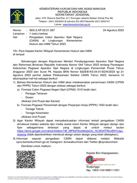 Crafting a compelling application letter is crucial when applying for the Civil Servant Candidate (CASN) selection at the Ministry of Law and Human Rights (Kemenkumham). Guys, this letter serves as your introduction and first impression to the selection committee. It’s your chance to showcase why you’re the ideal candidate and highlight your skills and experience in a way that aligns with Kemenkumham’s values and requirements. A well-written application letter can significantly increase your chances of moving forward in the selection process. Let’s dive into the key elements and provide a solid example to help you create a standout application. Remember, this is your opportunity to shine, so make it count! Make sure you understand the specific requirements outlined in the official CASN Kemenkumham announcement. Pay close attention to any specific instructions regarding the format, content, and attachments for your application letter. Failing to follow these instructions can result in your application being rejected. So, before you start writing, take the time to carefully review the guidelines. Now, let’s talk about the structure. Start with a professional and formal tone. Clearly state the position you are applying for. Highlight your relevant qualifications and experience that align with the job requirements. Express your enthusiasm and motivation for joining Kemenkumham. Proofread carefully for any grammar or spelling errors. Remember, your application letter reflects your attention to detail and professionalism. Make sure it’s polished and error-free. Good luck, and may your application letter open the door to your dream career at Kemenkumham!