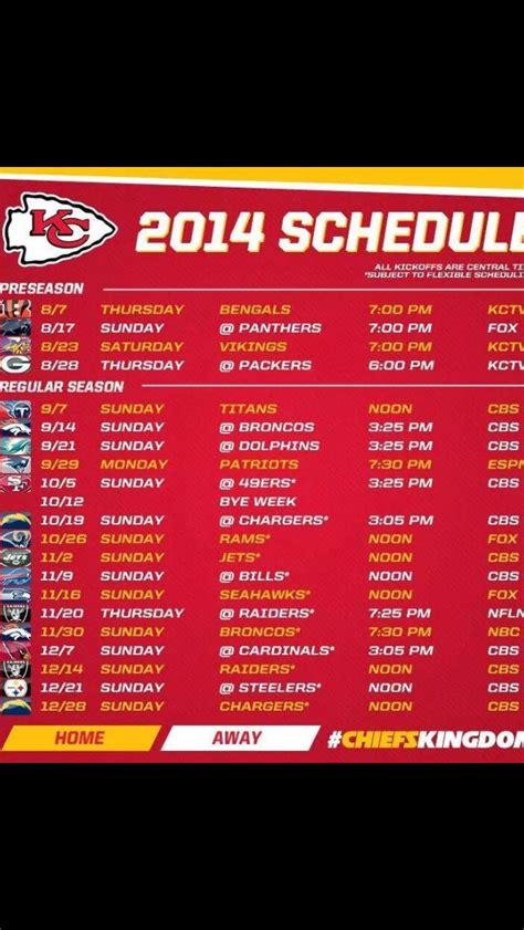 Hey guys! Let’s take a trip down memory lane and revisit the Kansas City Chiefs’ 2014 schedule . For all you die-hard Chiefs fans, or those just curious about the team’s history, this is your chance to relive a season that had its fair share of ups and downs. We’ll break down the games, talk about key moments, and see how the Chiefs fared that year. Get ready for a nostalgic dive into the 2014 NFL season from a Chiefs perspective!