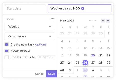 Now comes the fun part: customizing the recurrence. ClickUp gives you a ton of control here. You can choose how often the task repeats (daily, weekly, monthly, yearly), and then fine-tune the specifics. For example, if you choose “weekly,” you can select which days of the week the task should occur on. If you choose “monthly,” you can pick specific dates or even have it repeat on the first Monday of every month. You can also set an end date for the recurrence, or have it repeat indefinitely.