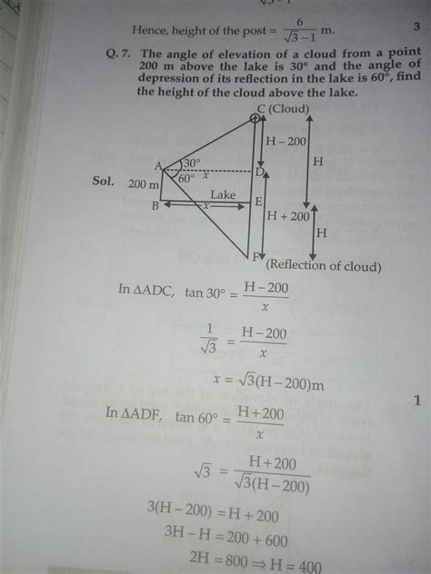 Alright, so the scenario is this: You’re standing somewhere, and you’re looking up at a cloud. You also happen to be standing above a lake (lucky you!). You measure the angle of elevation to the cloud – that’s the angle your line of sight makes with the horizontal. Then, you look at the cloud’s reflection in the lake, and you measure the angle of depression to that reflection. The angle of depression is the angle your line of sight makes with the horizontal downwards . We know the height from where the angle of elevation is observed from the lake and the angle of depression of its reflection in the lake. The question is, can we figure out the cloud’s actual height above the lake using this information? Absolutely! This problem is a classic application of trigonometry, using the principles of right triangles and the properties of reflection. The key here is to visualize the geometry correctly and use the right trigonometric functions.