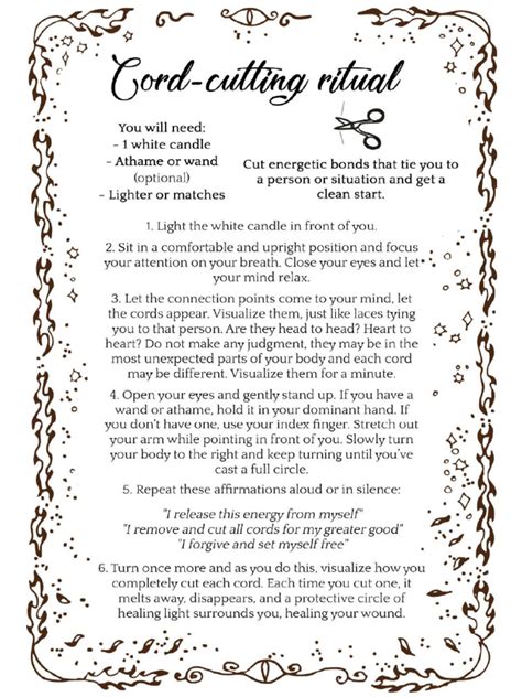 - State your intention: Out loud, state your intention for the ritual. Be clear and specific. For example, you might say, “I am here to cut the energetic cords that bind me to [name of person]. I release all negative energy and attachments that no longer serve me. I am free to move forward with love and light.”