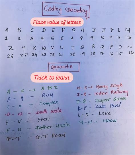 - Reverse Alphabetical Order: Similarly, being familiar with the reverse alphabetical order (Z=1, Y=2, …, A=26) can be incredibly useful, especially when dealing with reverse coding patterns. Some questions might directly use this order as the basis for the code.