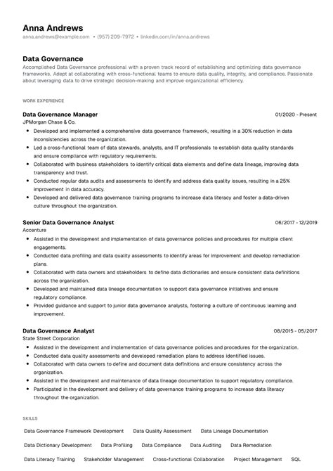 This is your prime real estate, folks – the professional summary or objective . For most experienced data governance pros, a summary is the way to go. This is your 2-4 sentence elevator pitch. It needs to hook the reader immediately and highlight your most impressive qualifications and career goals. Start with your title and years of experience, like: “Results-driven Data Governance Manager with 8+ years of experience designing and implementing enterprise-wide data governance frameworks.” Then, sprinkle in your key skills and a major accomplishment. Think: “Proven ability to improve data quality, ensure regulatory compliance (GDPR, CCPA), and enhance data security through strategic policy development and stakeholder engagement.” End with what you’re seeking, tailored to the specific job. If you’re changing careers or are more junior, an objective might be better. It should focus on your enthusiasm and transferable skills. For example: “Highly motivated aspiring Data Governance Analyst seeking to leverage strong analytical skills and a passion for data integrity to contribute to [Company Name]’s data governance initiatives. Eager to apply knowledge of data quality principles and metadata management in a challenging role.” Key takeaway: Tailor this section every single time you apply for a job. Use keywords from the job description. Make it compelling and concise. It’s your first impression, so make it count!