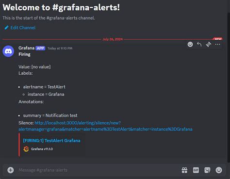 Making your Grafana alerts look good and provide maximum information in Discord is all about customizing the message format. Grafana’s templating engine is incredibly powerful here, allowing you to craft messages that are both informative and visually appealing within Discord’s structure. When you’re setting up your webhook contact point in Grafana, you’ll see options for message templating. For Discord, which uses a JSON payload format for webhooks, you’ll typically want to define a JSON structure that includes an embeds field. Embeds allow you to create rich, structured messages with titles, descriptions, fields, and even color-coded bars to indicate severity. Guys, this is where the magic happens! You can create an embed for each alert, populating fields like title with the alert name, description with a summary of the issue, and url with a direct link back to the specific Grafana alert or dashboard. Use color to visually distinguish between different alert severities – maybe red for critical, yellow for warning, and blue for informational. You can dynamically pull data from the alert using template variables like {{ .Labels.alertname }} , {{ .Annotations.summary }} , and {{ .Status }} . For example, a basic embed structure might look like this: {"embeds": [{"title": "Grafana Alert: {{ .Labels.alertname }}", "description": "{{ .Annotations.summary }}", "color": 1515832, "fields": [{"name": "Status", "value": "{{ .Status }}", "inline": true}, {"name": "Severity", "value": "{{ .Labels.severity }}", "inline": true}, {"name": "Details", "value": "[Link to Grafana]({{ .DashboardURL }})"}]}]} . Remember to adjust the color value (which is a decimal representation of RGB) and the fields to best suit your needs. The {{ .DashboardURL }} variable is particularly useful for quick access to investigate the issue. It’s all about making the alert actionable at a glance. Play around with different template functions and variables to extract all the relevant data you need. This level of customization ensures your team gets precise, actionable information directly in Discord, speeding up response times significantly.