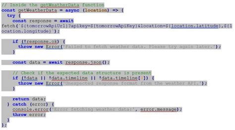 • We define an asynchronous function, fetchWeatherData , which uses async and await to handle the HTTP request. This lets us make the request without blocking the main thread, keeping the UI responsive. Make sure to replace 'YOUR_API_KEY' with your actual API key. Keep in mind that storing the API key directly in your code like this is not recommended for production apps (we’ll cover more secure methods later).