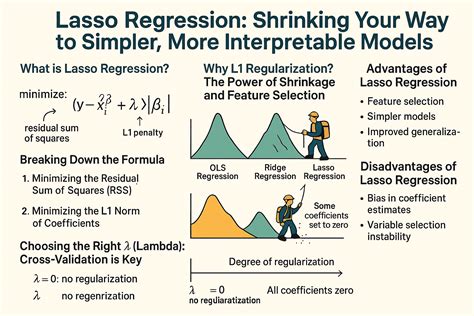 Alright, let’s get down to the nitty-gritty of how Lasso Regression machine learning actually pulls off its impressive tricks. At its heart, Lasso Regression, or Least Absolute Shrinkage and Selection Operator , modifies the standard linear regression cost function. If you remember OLS regression, its goal is to minimize the sum of squared residuals—basically, the difference between what your model predicts and what the actual values are. Lasso takes this a step further by adding what we call an L1 penalty (or L1 regularization term) to this cost function. This L1 penalty is directly proportional to the absolute value of the magnitude of the coefficients. So, instead of just trying to fit the data as closely as possible, Lasso also tries to keep the absolute values of the coefficients as small as possible. The formula looks a bit intimidating at first, but the intuition is quite simple: minimize (Sum of Squared Errors) + λ * (Sum of Absolute Values of Coefficients). That little Greek letter, lambda (λ), is super important—it’s our hyperparameter . Lambda controls the strength of the penalty. When lambda is zero, Lasso behaves exactly like OLS regression, with no penalty applied. As you increase lambda, the penalty becomes stronger, forcing more and more coefficients to shrink towards zero. The truly magical part of Lasso is its ability to shrink some coefficients exactly to zero . This is the feature selection aspect in action! Because it uses the absolute value (L1 norm), it creates a diamond-shaped constraint region in the geometric interpretation of the optimization problem. When the error function’s contours intersect this diamond, they often hit corners, which correspond to some coefficients being exactly zero. This is a key differentiator from Ridge Regression, which uses an L2 penalty (squared magnitudes) and tends to shrink coefficients towards zero but rarely to zero. This unique property of Lasso means it’s not just regularizing your model; it’s actively simplifying it by identifying and eliminating less important features. This process leads to sparse models , meaning models with fewer features, which are often easier to understand, interpret, and less prone to overfitting . Understanding this core mechanism is crucial for appreciating why Lasso Regression machine learning is such a powerful tool in your data science arsenal, especially when faced with high-dimensional data where many features might be redundant or irrelevant.