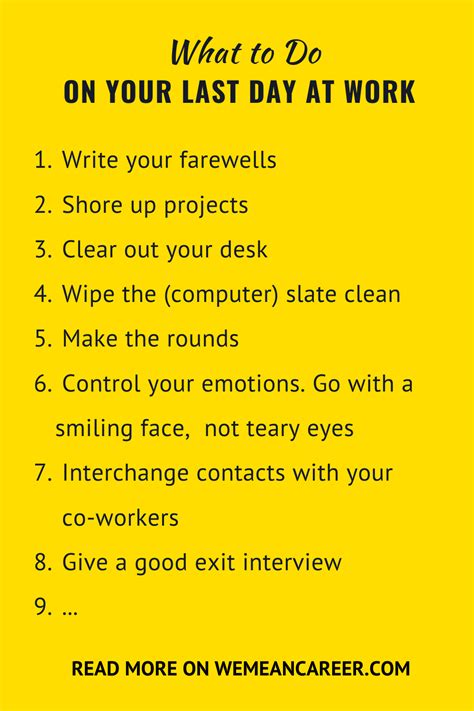 Okay, so beyond the feels, there’s the actual how of your last day of work . This is where professional etiquette really shines, guys. You want to leave on a high note, right? You don’t want any lingering awkwardness or bad vibes. The meaning of your last day of work in a professional context is all about leaving a positive and lasting impression. First things first: tie up loose ends . This is crucial. Finish any outstanding tasks, submit final reports, and make sure your handover is seamless. Your colleagues and your replacement will seriously thank you for this. A good handover means the transition is smooth, and it shows you’re responsible and committed right up to the very end. Communicate with your manager . Have a final check-in. Discuss your departure, confirm any final administrative details (like when you’ll receive your last paycheck or any severance information), and express your gratitude for the opportunity. This conversation solidifies the significance of your last day at work as a professional closing. Don’t be afraid to ask questions about benefits, references, or anything else you might need clarification on. Back up your personal files . Make sure anything you need for your personal records is saved, but ensure you’re not taking any company proprietary information – that’s a big no-no! Companies often have policies about this, and you don’t want to leave with any ethical or legal gray areas. The meaning of leaving your job gracefully involves respecting company policies. Organize your workspace . Clean out your desk, throw away trash, and return any company property (laptops, keys, ID badges). A tidy space leaves a good final impression. Think of it as leaving your temporary home neat and tidy for the next occupant. Say your goodbyes thoughtfully . This is where the emotional part meets the professional. Send out a professional farewell email to your colleagues. Keep it concise, positive, and include your personal contact information if you wish to stay connected. Avoid negativity or complaints in this email – save that for a private conversation with your manager if absolutely necessary, and even then, tread carefully. The meaning of the last day of work often involves curated interactions. You might want to have individual chats with key colleagues or your team to express personal thanks. Be professional until the very end . This means no slacking off or complaining loudly about the company on your last day. Maintain your work ethic and positive attitude. Even if you’re eager to leave, remember that your reputation precedes you. The last day of work significance is tied to your professional reputation. Accept your final pay and benefits information . Know when and how you’ll receive your final pay, any accrued vacation payout, and information about health insurance continuation (like COBRA in the US). This is a practical aspect of the meaning of ending employment . Finally, exit with grace . Avoid burning bridges. You never know when paths might cross again in the future. The last day of work meaning is to depart with dignity, professionalism, and a forward-looking attitude, ensuring that your exit is as positive as your tenure was valuable.