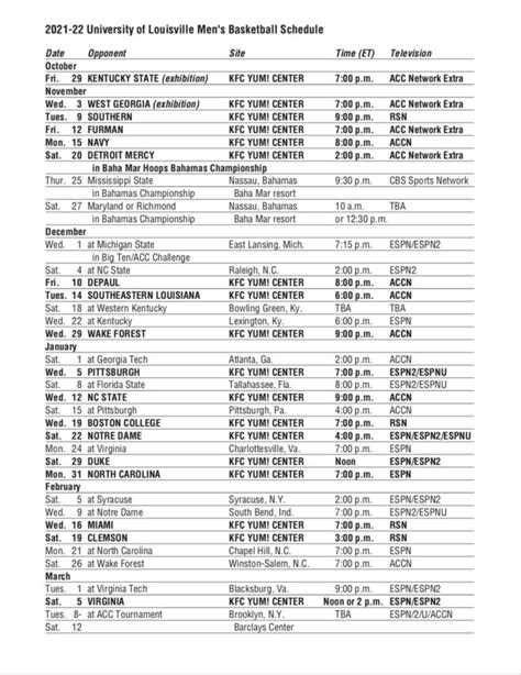 Understanding the Louisville basketball schedule is like having a secret map to all the epic battles on the court. We’re talking about matchups that could define the season, rivalries that bring out the best (and loudest!) in the fanbase, and those crucial conference games that determine seeding in the big dance. When we look at the schedule, it’s not just about listing dates and times; it’s about anticipating the intensity, the strategies, and the sheer athleticism that the Cardinals will bring. Each game presents a unique challenge, a test of their skills, and an opportunity to showcase their talent. From early-season non-conference tests that help build confidence and RPI, to the grueling gauntlet of ACC play, every game matters. We’ll be highlighting key matchups, potential upsets, and those must-watch games that will have you glued to your screen. Think about those intense home games at the KFC Yum! Center, where the Cardinal faithful bring an electric atmosphere that can rattle any opponent. Then, consider the road games, where the team has to battle hostile crowds and unfamiliar environments. It’s this mix of challenges that makes following the Louisville basketball schedule so captivating. We’re going to break down the schedule not just by opponent, but by the narrative each game creates. Are there new rivalries forming? Are there rematches from previous seasons that hold extra significance? We’ll explore all of this and more, giving you the context you need to truly appreciate every buzzer-beater and every defensive stand. So, if you’re ready to get hyped for a season filled with incredible basketball, stick with us as we unpack the Louisville basketball schedule in detail. You won’t want to miss a single tip-off!