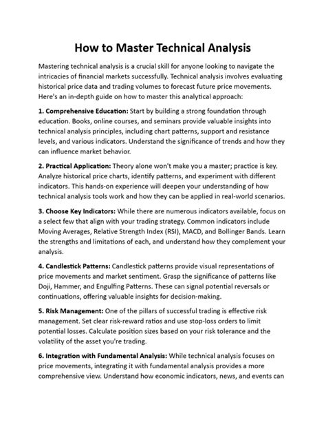 Within these assumptions, you’ll explore various tools and techniques. Chart patterns are a big one – think of patterns like triangles, flags, pennants, head and shoulders, and double tops/bottoms. These patterns can signal potential continuations or reversals of a trend. Then there are candlestick patterns , which provide even more granular detail about price action within a specific timeframe, like doji, hammers, and engulfing patterns. You’ll also get intimately familiar with technical indicators . These are mathematical calculations based on price and volume that can help confirm trends, gauge momentum, identify overbought/oversold conditions, and even predict future price movements. Popular examples include Moving Averages (like the 50-day or 200-day MA), the Relative Strength Index (RSI), MACD (Moving Average Convergence Divergence), Bollinger Bands, and Fibonacci retracements. Understanding how to use these indicators in conjunction with each other, not in isolation, is key to developing effective trading strategies. Most courses will also cover volume analysis , which looks at the number of shares or contracts traded, to gauge the strength and conviction behind price moves. High volume on a breakout, for instance, adds more credibility to the move. Finally, a good course will emphasize risk management , teaching you how to set stop-losses, manage position sizes, and protect your capital. This is arguably the most important part of trading, as without it, even the best technical analysis skills won’t save you from blowing up your account. So, yeah, it’s a lot, but that’s why you need a structured course to break it all down!