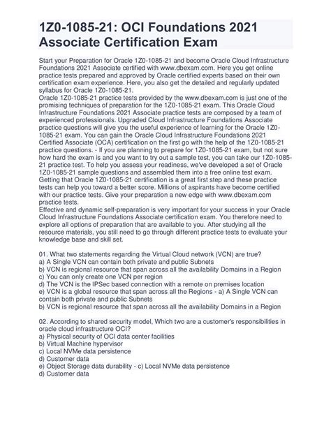 Alright, so you know what’s on the exam, but how do you actually prepare to ace the Oracle Cloud Infrastructure (OCI) Foundations Associate Exam ? Strategy is key, folks! First things first, grab that official exam guide . I mentioned it before, but it’s worth repeating. This document is your roadmap. It outlines the domains, topics, and even the specific learning objectives for the exam. Use it to assess your current knowledge and identify your weak spots. Next, dive into Oracle’s official training resources. They offer a fantastic free digital training course specifically for the Foundations Associate certification. This is usually your best bet for accurate and up-to-date information. It’s structured, covers all the essential topics, and often includes practice questions. Don’t just passively watch the videos; take notes, actively engage with the material. If you’re more of a hands-on learner, definitely leverage OCI’s free tier . Spin up some virtual machines, create some object storage buckets, play around with VCNs. Actually using the services solidifies your understanding way more than just reading about them. Trust me on this one. Create a study schedule and stick to it. Break down the content into manageable chunks and allocate specific times for studying each domain. Consistency is more important than cramming. Find some good practice exams. Many online platforms offer OCI practice tests that simulate the real exam environment. These are invaluable for gauging your readiness, identifying areas where you need more work, and getting comfortable with the question format and time constraints. Look for tests that offer detailed explanations for both correct and incorrect answers – learning why an answer is right or wrong is just as crucial as getting it right. Consider joining online communities or forums dedicated to OCI. You can find great discussions, ask questions, and learn from others who are also preparing for the exam or already certified. Sometimes, hearing different perspectives can clarify complex topics. Don’t underestimate the power of flashcards for key terms, acronyms, and service definitions. Create a cheat sheet (for studying purposes, obviously!) of important concepts, commands, and best practices. When you feel confident, go for the exam! Remember, preparation is a marathon, not a sprint. Pace yourself, stay consistent, and believe in your ability to learn and succeed. The OCI Foundations Associate exam is designed to be accessible, so with a solid study plan, you’ve got this!