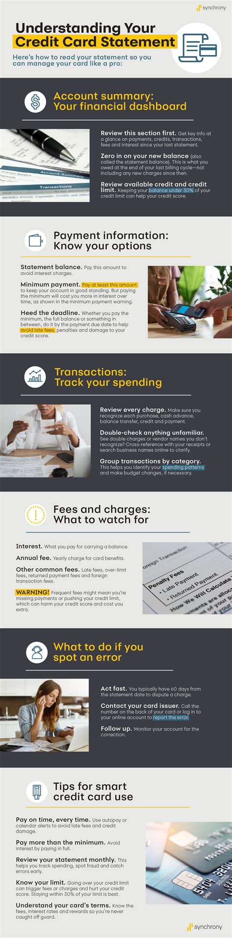Credit card statements often include a section detailing various fees and charges that may have been applied to your account. It’s essential to understand what these fees are and how to avoid them. Common fees include late payment fees , over-limit fees, and cash advance fees. Late payment fees are charged when you fail to make at least the minimum payment by the due date. Over-limit fees occur when you exceed your credit limit. Cash advance fees are charged when you use your credit card to withdraw cash from an ATM or bank. To avoid these fees, always pay your bills on time, stay within your credit limit, and avoid using your credit card for cash advances. Setting up payment reminders or automatic payments can help you avoid late fees. Monitoring your spending and staying within your credit limit will prevent over-limit fees. Exploring alternative options for accessing cash, such as using a debit card, can help you avoid cash advance fees. Understanding and avoiding these fees can save you money and keep your credit card account in good standing.
