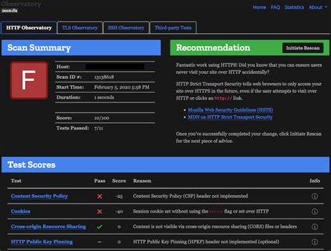 Let’s break down some of the key things the Mozilla Observatory can do. First off, it’s a website scanner . You give it a URL, and it does a deep dive, checking for many vulnerabilities . This includes checking the HTTP headers , which tell the browser how to behave when dealing with your site’s content. Think of headers like instructions for the browser – and ensuring these are set up correctly is crucial. It also scans for the presence of SSL/TLS (the padlock in your browser’s address bar), checking that your site uses a secure connection. The Observatory also looks for common web application security issues, like cross-site scripting (XSS) and clickjacking vulnerabilities. These are types of attacks that hackers often use to steal data or trick users. The tool checks for things like Content Security Policy (CSP), a crucial security feature that helps prevent XSS attacks. The Observatory also provides a grade, from A+ to F, based on the results of the scan. This gives you a quick and easy way to understand your site’s security level at a glance. But it’s not just about the grade; it’s about the detailed report it generates. The report breaks down the different checks, explains what they mean, and provides recommendations for improving your security score. The Observatory also includes recommendations on how to set up security features like HTTP Strict Transport Security (HSTS), which tells browsers to always use HTTPS. This protects your site from downgrade attacks, where a hacker tries to force a user onto an insecure connection. Moreover, the tool is constantly updated to include the latest security checks and adapt to the ever-evolving threat landscape. This means that using the Observatory not only helps you secure your site today but also helps you stay ahead of cybersecurity threats in the future. In essence, the Mozilla Observatory combines thorough website scan capabilities with educational resources, making it a valuable tool for anyone serious about website security.