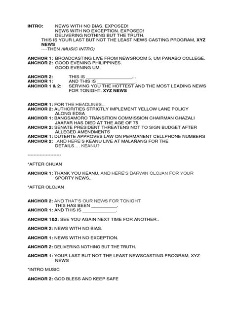 Crafting an effective newscast script is more than just stringing together a few sentences. It’s about creating a narrative that informs, engages, and sometimes even moves your audience. Before we get into the nitty-gritty, let’s cover some fundamental aspects. First off, your script needs to be clear and concise. Avoid jargon or overly complex language. Remember, you’re speaking to a diverse audience, and clarity is key. Next, accuracy is paramount. Double-check your facts, verify your sources, and ensure you’re presenting information that’s trustworthy. Credibility is everything in news reporting. Also, structure matters. A typical newscast script follows a specific format: an introduction, the main news stories, feature segments, and a conclusion. Each of these elements plays a vital role in delivering a well-rounded news program. Let’s not forget about visuals. A good script considers the visual elements that will accompany the news, such as video footage, graphics, and images. These visuals enhance the storytelling and help to keep viewers engaged. Finally, practice makes perfect. Rehearse your script multiple times to ensure a smooth and natural delivery. Pay attention to your pacing, tone, and pronunciation. The more comfortable you are with the material, the more confident you’ll appear on camera. So, whether you’re a seasoned journalist or just starting out, understanding these basics will set you on the path to creating compelling and informative newscast scripts.