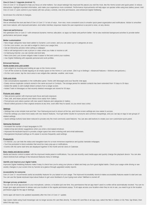 One of the primary goals of One UI Core 3.1 is to provide a user-friendly interface that is easy to navigate. Samsung has paid close attention to simplifying menus and settings, making it easier for users to find what they need. The visual elements are also designed to be less cluttered and more visually appealing. In addition to its aesthetic improvements, One UI Core 3.1 brings significant performance enhancements. By optimizing the software for mid-range and lower-end devices, Samsung ensures that users can enjoy a fluid and responsive experience. This includes faster app loading times, smoother multitasking, and improved battery efficiency. The update also incorporates many of the privacy and security enhancements introduced in Android 11, giving users greater control over their personal data and device security. Overall, One UI Core 3.1 is designed to deliver a comprehensive and optimized Android experience to a wider range of Samsung users, ensuring that even those with budget-friendly devices can enjoy the latest features and improvements.