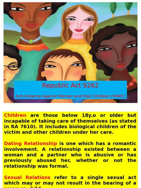 Republic Act 9262 , also known as the Anti-Violence Against Women and Their Children (VAWC) Act of 2004 , is a landmark piece of legislation in the Philippines. This law addresses a critical social issue by defining and criminalizing various forms of violence against women and children. Its primary goal is to protect the rights and welfare of women and children by providing legal remedies and support systems for victims of abuse.