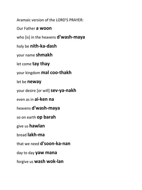 Alright, let’s get into the nitty-gritty! Here’s the Aramaic text of the Lord’s Prayer alongside a clear English translation. Seeing them side-by-side helps us understand the original meaning and how it compares to the versions we typically use today. Understanding the original Aramaic words helps to bring new perspective to this traditional and important prayer, as well as helping to bridge the gap to the world in which Jesus lived and taught. The subtle nuances of each Aramaic word paint a vibrant picture, revealing layers of meaning that might otherwise be overlooked. Plus, by comparing the original text with our modern translations, we can appreciate the incredible work of scholars who have dedicated themselves to preserving and interpreting these sacred words. It’s like uncovering a hidden treasure, guys – each word shines a light on the deeper spiritual truths embedded within the prayer.