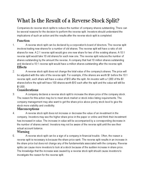 Okay, guys, so we’ve covered legality and mechanics. Now, let’s talk about the elephant in the room: what does a reverse stock split mean for you as an investor? This is where things get a bit more nuanced, and frankly, often where the sentiment turns negative. While a reverse stock split is a legal maneuver to increase the share price, it’s frequently a sign of underlying trouble for the company. Think about it: why would a company need to artificially inflate its stock price unless it was in trouble? Most often, a reverse split is a sign of distress . The company’s stock has likely been performing poorly, its value has plummeted, and it’s struggling to meet exchange listing requirements or attract investors. So, while your share count goes down, the hope is that your investment value doesn’t decrease proportionally over time – but the reality is often different. The immediate effect, as we discussed, is that your share price goes up. If you owned 1000 shares at \(0.50 (\) 500 total), after a 1-for-10 split, you’d have 100 shares at \(5.00 (\) 500 total). On paper, you’re still at the same value. However, the market’s reaction post-split is critical. Often, the stock price continues to decline even after the reverse split. Why? Because the reverse split didn’t fix the fundamental problems plaguing the company – its poor financials, weak management, declining revenues, or uncompetitive products. Investors see the reverse split as a bandage on a deeper wound. It might keep the stock on an exchange for a while, but it doesn’t make the company inherently more valuable. Furthermore, reverse splits can sometimes lead to reduced liquidity . With fewer shares outstanding, the trading volume might decrease, making it harder to buy or sell shares quickly without affecting the price. Also, remember those fractional shares we talked about? If you owned very few shares and end up with a fractional share that the company cashes out, you could be forced to sell your entire position, even if you wanted to hold on. This can be frustrating if you believe in the company’s long-term prospects. Another factor to consider is investor sentiment . A reverse split can be perceived negatively by the market, signaling that management is resorting to cosmetic changes rather than addressing core business issues. This negative sentiment can lead to further selling pressure. So, while technically legal and a tool for companies, you, as an investor, should view a reverse stock split with a healthy dose of skepticism. It’s not a guaranteed path to recovery for the stock. You need to look beyond the increased share price and analyze the company’s underlying business, its financial health, and its future prospects to determine if it’s still a worthwhile investment. Don’t just get excited because the price per share looks higher. Always do your due diligence, guys!