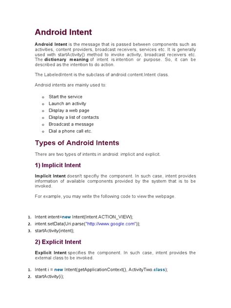 There are two main flavors of Intents: explicit and implicit . An explicit intent is when you specify the exact component (like a specific Activity class) that should handle the intent. This is like sending a letter directly to a specific person’s house. You know exactly who you want to receive it. This is typically used for communication within your own application or when you want to launch a very specific known component in another app.