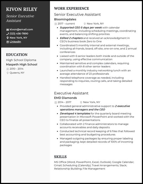 Alright, let’s kick things off with the most crucial part of your resume: the summary or objective. For a senior executive administrative assistant position, a summary is usually the way to go. Think of it as your elevator pitch – a concise, compelling snapshot of who you are professionally and what you bring to the table. We’re talking about 3-4 sentences that highlight your most impressive skills, years of experience, and key achievements. Start strong! Use keywords relevant to the job description right from the get-go. For example, instead of saying “Experienced administrative assistant,” try something like: “Highly accomplished and results-oriented Senior Executive Administrative Assistant with 10+ years of experience supporting C-suite executives in fast-paced corporate environments. Proven ability to manage complex calendars, streamline operations, and maintain the highest level of confidentiality and professionalism.” See the difference? It’s direct, it uses impactful language, and it immediately tells the recruiter you have the seniority and capability they’re looking for. You want to quantify your achievements here if possible. Did you reduce overhead costs by implementing a new filing system? Did you improve communication efficiency by introducing a new software? Mention it! Numbers speak volumes and make your claims more tangible. Also, tailor this summary for each job application. Read the job description carefully and weave in the specific requirements and keywords they’re looking for. If they emphasize travel arrangements, highlight your expertise in coordinating complex domestic and international trips. If they mention event planning, showcase your successful track record in organizing executive retreats or conferences. This isn’t just about listing your skills; it’s about demonstrating your understanding of the specific needs of the role and the company. Your summary should convey your value proposition clearly and confidently. It needs to grab their attention and make them want to read the rest of your resume. Remember, this is often the first (and sometimes only) thing a hiring manager reads, so make it count! It’s your golden ticket to making a stellar first impression and setting the stage for the rest of your professional story. Let’s make this opening statement absolutely unforgettable, shall we?