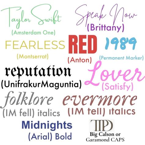 Alright, let’s get into the specifics ! What fonts did Taylor use on her albums? Well, it varies, and sometimes the fonts are custom-made, but we can find some close matches. For her debut album, “Taylor Swift,” a simple, clean font like Arial or Helvetica is a good starting point. These are standard fonts, but they capture the youthful, straightforward vibe of the album. For “Fearless,” a bolder serif font like Trajan Pro or Garamond is a great choice. These fonts have a classic, elegant feel that matches the album’s romantic themes. “Speak Now” features a whimsical, fairytale-like font. Something like Mrs. Eaves or Playfair Display can capture that magical quality. “Red” uses a mix of fonts, including a bold sans-serif for “Red” and a typewriter-style font for the handwritten notes. Try using Impact for the title and Courier New for the notes to replicate this look. “1989” goes for a sleek, modern aesthetic. A font like Futura or Montserrat will give you that clean, contemporary vibe. “Reputation” is all about edgy, bold typography. A strong sans-serif font like Bebas Neue or Impact is perfect for capturing the album’s rebellious spirit. “Lover” uses a soft, romantic font. Something like Quicksand or Raleway will give you that gentle, dreamy feel. “Folklore” and “Evermore” both feature rustic, handwritten-style fonts. Try using Amatic SC or Permanent Marker to capture that cozy, intimate vibe. And for “Midnights,” a sophisticated serif font like Didot or Times New Roman works well. Remember, the key is to experiment and find what looks best for your project. Don’t be afraid to mix and match fonts to create your own unique Taylor-inspired designs!