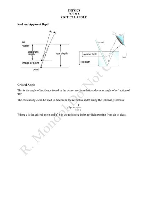 • Temperature and Pressure: For gases, the refractive index can be significantly affected by temperature and pressure. Therefore, the critical angle for light passing between a liquid and a gas, for instance, can change depending on ambient conditions. However, for solids and liquids under normal conditions, these effects are usually negligible.
