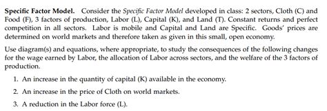 Alright, let’s talk about how the OSckonsepsc Specific Factor Model deals with production, relative prices, and factor payments . This is where the model gets really interesting, as it explains how trade affects what’s produced, how much it costs, and who gets paid. Firstly, let’s talk about production . The model assumes that each economy has a production function for each good. The production function describes how inputs (labor, capital, and land) are combined to produce output. In the manufacturing sector, output is a function of labor and capital, while in the agricultural sector, output is a function of labor and land. The production possibilities frontier (PPF) is bowed out because of the diminishing returns to labor. This is because, as more labor is employed in a sector, the marginal product of labor declines. For instance, when the economy opens to trade, it will specialize in the production of goods in which it has a comparative advantage. This leads to changes in production levels in both sectors. Now, let’s consider relative prices . Before trade, the relative prices of goods are determined by domestic supply and demand. When trade opens up, relative prices will converge to a level between the pre-trade prices of the two countries. The relative price of a good increases in the exporting country and decreases in the importing country. This affects the returns to the specific factors. For example, if a country exports manufactured goods, the price of these goods will rise, leading to an increase in the return to capital (the factor specific to manufacturing). The opposite happens in the agricultural sector. As for factor payments , the model makes some predictions. Wages will generally increase, but the impact will depend on the sector. The return to the specific factor in the exporting sector will increase, while the return to the specific factor in the importing sector will decrease. The model also assumes that labor moves between sectors to maximize wages. The sector with the higher wage will attract more labor. This migration of labor continues until wages are equalized across sectors. Understanding these dynamics is crucial for grasping the effects of trade on different groups within an economy. Next, let’s explore how the model predicts the effects of trade on income distribution and resource allocation.