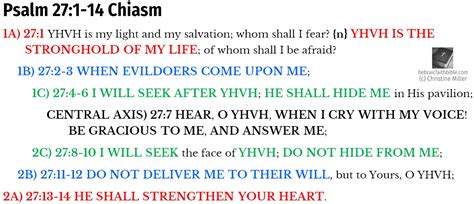 Now, let’s bring our focus to Psalm 27 . This psalm is incredibly powerful on its own, dealing with themes of God’s protection, deliverance, and the longing for His presence. But when you start to see the chiasm within it, it’s like the psalm gets a whole new dimension. Many scholars have identified chiastic structures within Psalm 27, and while there can be slight variations in how they’re diagrammed, the core idea is consistent: a beautiful, symmetrical arrangement that underscores its central message. We’re talking about a carefully crafted literary masterpiece here, guys, designed to guide the reader through a journey of faith, from initial fear and seeking to ultimate trust and dwelling in God’s house. The psalm begins with declarations of God’s strength and deliverance, moves through expressions of personal fear and vulnerability, and then circles back to unwavering confidence and a desire for continued communion with God. This A-B-C, C’-B’-A’ pattern isn’t accidental; it’s intentional, designed to create a powerful rhetorical effect and to highlight the psalm’s ultimate message of steadfast faith in the face of adversity. It’s truly amazing how ancient writers could weave such complexity and beauty into their words.