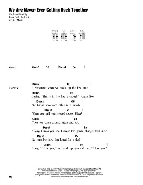 Hey guys! Ever find yourself humming along to that super catchy Taylor Swift tune, “We Are Never Ever Getting Back Together,” and wishing you could strum along? Well, you’re in luck! Today, we’re diving deep into the guitar chords that make this pop anthem so infectious. It’s one of those songs that just screams singalong potential, and learning the chords is your ticket to joining the party. Whether you’re a seasoned strumming pro or just starting out, this guide is designed to break down the magic behind those chords, making it totally accessible. We’ll explore the specific chords used, how they fit together to create that signature sound, and even give you some tips on strumming patterns that will get you sounding just like Taylor. This song is a fantastic one for beginners because it uses relatively simple chord progressions that are easy to get a handle on. So, grab your acoustic or electric guitar, tune it up, and let’s get ready to rock out to one of Taylor’s biggest hits. We’ll make sure you’re not just playing the chords, but you’re feeling the song, understanding the transitions and the rhythm that makes it all work. This isn’t just about hitting the right notes; it’s about capturing the attitude of the song. Get ready to become the life of the next campfire singalong or impress your friends with your newfound guitar skills. We’re going to go through it step-by-step, so no one gets left behind. It’s all about having fun and making music, and this song is the perfect vehicle for that. So, let’s stop talking and start playing, shall we? Prepare to master the chords to “We Are Never Ever Getting Back Together” and unleash your inner pop star. It’s going to be a blast, I promise!