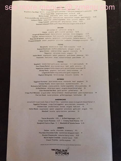Ultimately, dining at The Italian Kitchen by Wolfgang Puck is about more than just the food on the Wolfgang Puck Italian Kitchen menu ; it’s about the entire Wolfgang Puck Italian Kitchen experience . From the moment you step inside, you’re enveloped in an atmosphere that’s both chic and welcoming. The ambiance is carefully curated to reflect the sophisticated yet comfortable nature of the cuisine. Think warm lighting, elegant décor, and attentive service that makes you feel right at home, whether you’re celebrating a special occasion or just enjoying a casual dinner with friends. The Wolfgang Puck Italian Kitchen menu is a reflection of Puck’s culinary philosophy: high-quality ingredients, expert preparation, and a passion for creating memorable dishes. Each item on the menu is crafted with care, aiming to provide a taste of authentic Italian flavors with a distinct Wolfgang Puck signature. The staff are knowledgeable and passionate about the food, ready to guide you through the menu and offer recommendations, ensuring your dining experience is seamless and enjoyable. It’s this combination of exceptional food, inviting atmosphere, and impeccable service that defines the Wolfgang Puck Italian Kitchen experience . It’s a place where you can savor traditional Italian dishes elevated to a new level, where every bite tells a story of culinary excellence. Whether you’re indulging in a multi-course meal or simply enjoying a glass of wine with an appetizer, the attention to detail is palpable. The Wolfgang Puck Italian Kitchen menu serves as your guide, but the true magic happens when all the elements come together. It’s a destination for those who appreciate fine dining without pretense, a place that consistently delivers on flavor, quality, and a truly enjoyable dining occasion. So, next time you’re looking for an Italian culinary adventure, remember the Wolfgang Puck Italian Kitchen menu – it’s your ticket to an unforgettable experience.